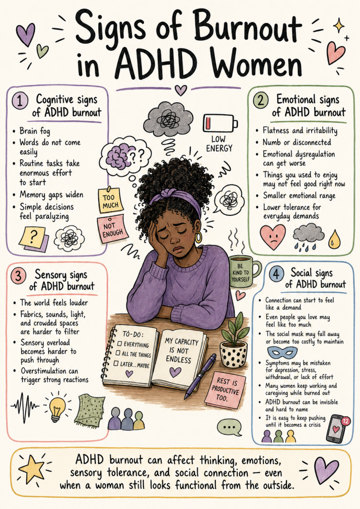 What makes this particularly hard for ADHD women is that many of these symptoms look, from the outside, like they could be attributed to other things. Depression. Stress. Not trying hard enough. The invisibility of burnout is part of what makes it so difficult to name, and so easy to push through until it becomes a crisis.