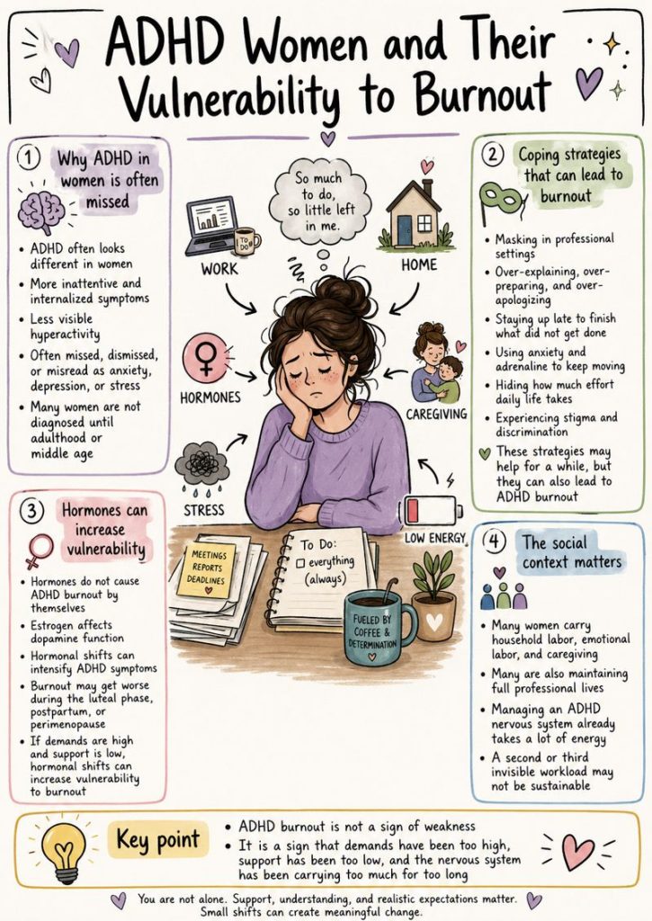 The social context matters too. Women are still disproportionately responsible for household labor, emotional labor, and caregiving — often while maintaining full professional lives. When an ADHD woman is already spending enormous energy managing her own nervous system, adding a second or third full-time invisible workload to that is not manageable indefinitely.